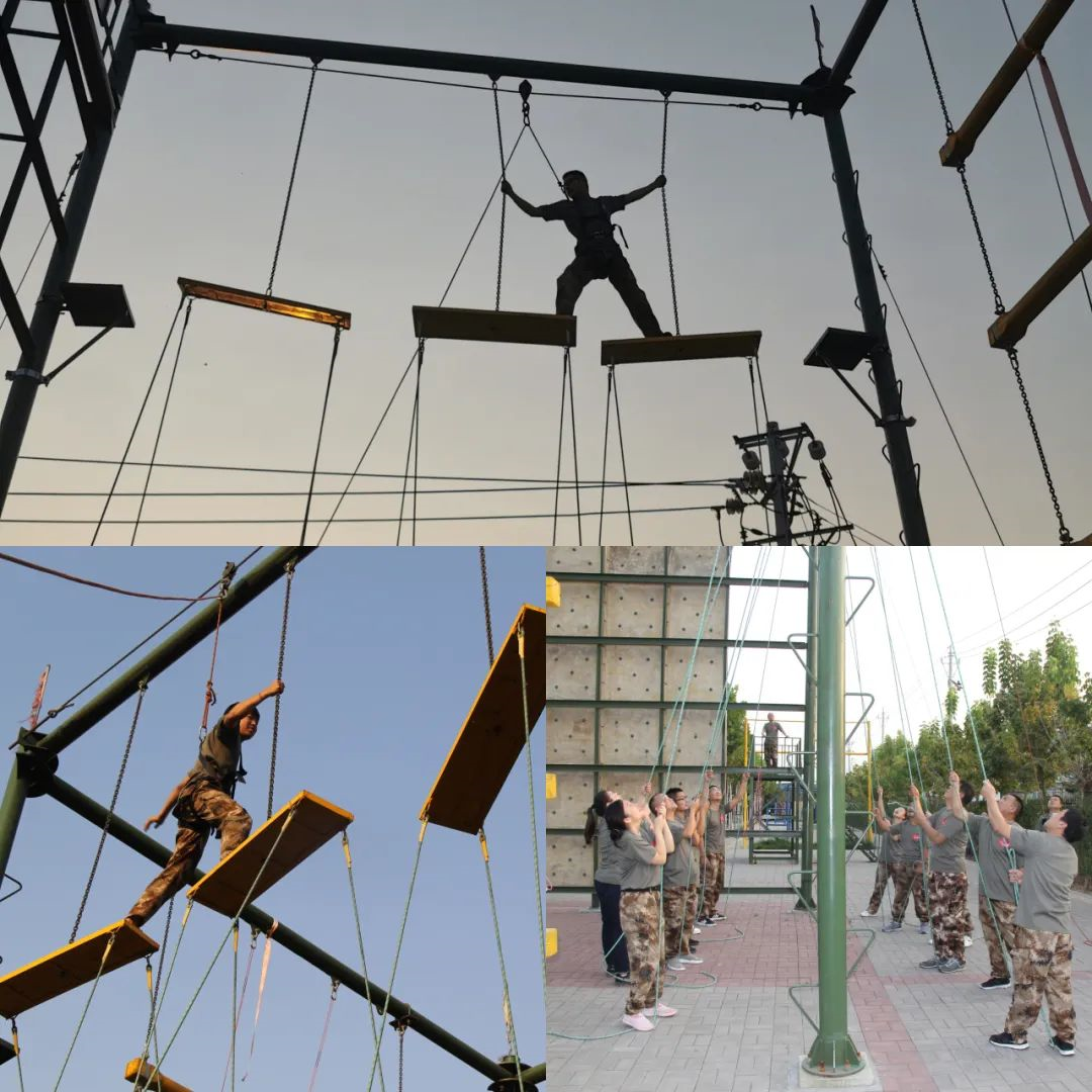 在严肃活泼的氛围中,拓展训练正式拉开帷幕。大家进行军事基本动作训练规范,开展旗人旗事:定队名、选队长、唱队歌,为自己的队伍鼓劲加油,而后团结一心,成功挑战了击鼓颠球、急速60秒、穿越电网、高空挑战项目。在拓展活动中,所有队员都全身心投入,没有年龄差距,没有职位高低、没有性别差异,重燃青春之火,挥洒豪情,释放自我。